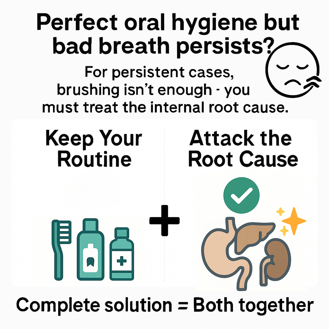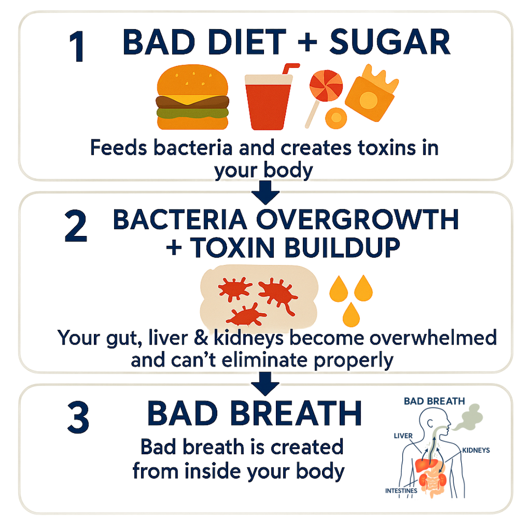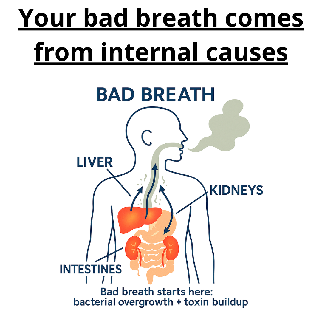 Persistent bad breath comes from inside your body — specifically your intestines, liver, and kidneys. When bacteria multiply in your gut and toxins build up because your organs can't filter them properly, these odors are released through your breath.